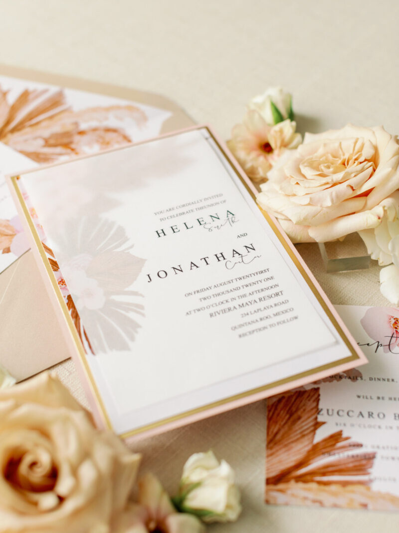 The Punta Cana wedding invitation suite is an exquisite combination of gold and pink hues, adorned with delicate orchids and elegant pampas grass motifs. The tropical vellum wedding invitation suite exudes a modern bohemian charm, capturing the essence of a romantic and enchanting wedding celebration. To complete the captivating ensemble, the wedding invitation features a tropical floral envelope liner, adding a touch of tropical paradise. This meticulously crafted suite is the epitome of style and sophistication, setting the perfect tone for a truly memorable and extraordinary wedding experience.