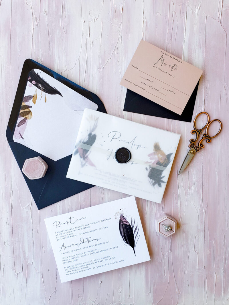 These gorgeous moody wedding invitations feature a vellum wrap carefully wrapping a printed invitation layered with a moody bellyband printed with a dark floral design. The dark moody floral with blush roses, is also present on the optional custom printed envelope liner. This moody wedding invitation set is the perfect fit for the modern couple who wants to make a bold statement with an elegant and opulent invitation.