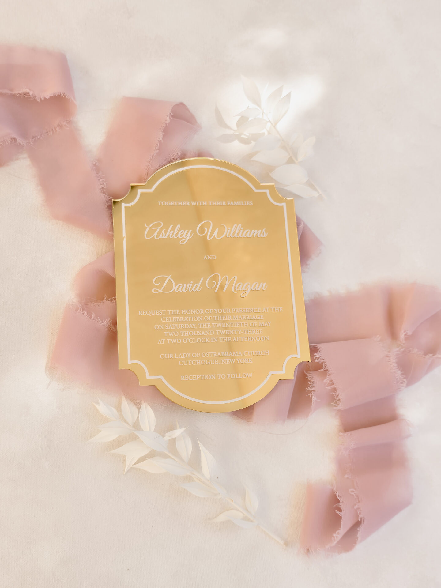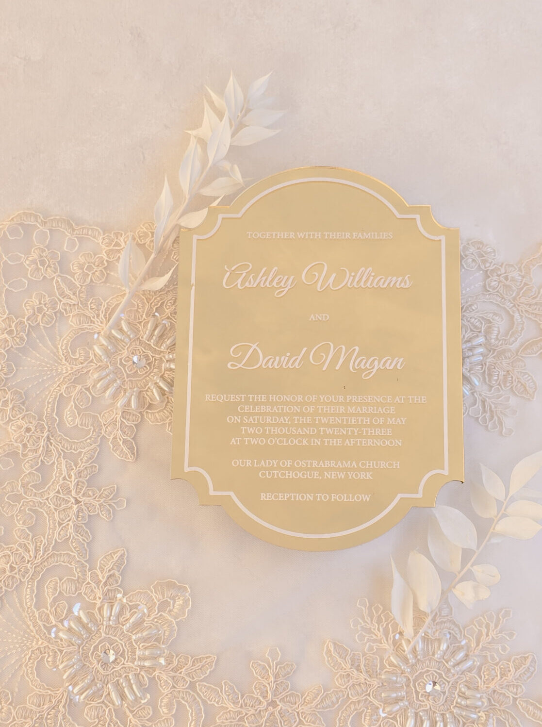 Vintage ornate cut acrylic invitation in gold mirror